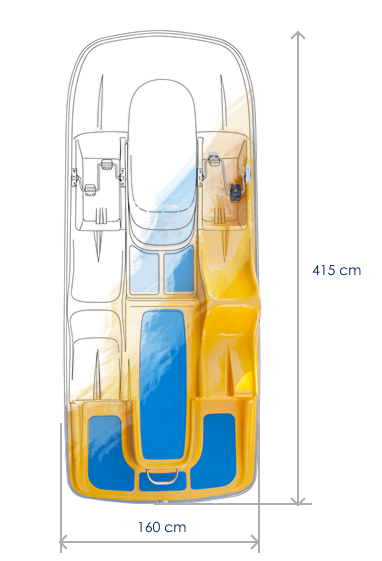 Podwyższona przestrzeń pomiędzy siedzeniami jest doskonałym miejscem na bagaż. Sprawdza się też świetnie jako dodatkowe siedzenie na przykład dla dziecka. Obniżony tylny pokład, pozwala na lepszy kontakt z przyrodą, a w połączeniu z nierdzewnym uchwytem, ułatwia wejście i wyjście z wody.